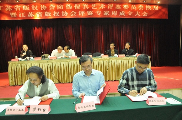 會上,愛濤文化集團同江蘇省版權協會防偽保真藝術評鑒委員會、江蘇鳳凰國際拍賣公司簽訂戰略合作協議,三方共同攜手引領誠信消費新風尚,為江蘇省藝術品市場保駕護航。