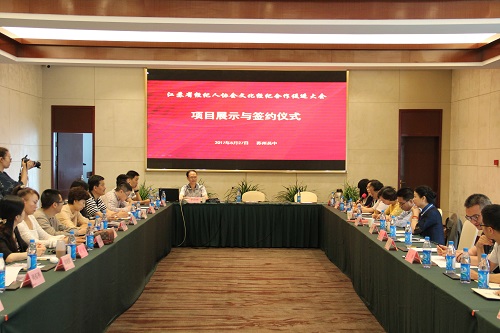 “合作項目宣推圓桌會議”于 5月27日下午如期舉行,參會的文化主管部門、文化企業負責人、文藝家代表積極對合作項目進行宣推。會上,江蘇省文交所、徐州市文化產業協會、蘇州蘇豪文化創意園、蘇州工藝絲綢、南京遠宏公關非遺項目、南京蒼潤齋、蘇州向紅繡府等10家單位現場簽約6個合作項目,另外淮安市清江浦區文廣新局、鎮江文化市場行業協會、江蘇盛世堂文化、南京深博視覺文化等6家單位達成8個戰略合作、人才培養等項目合作意向。